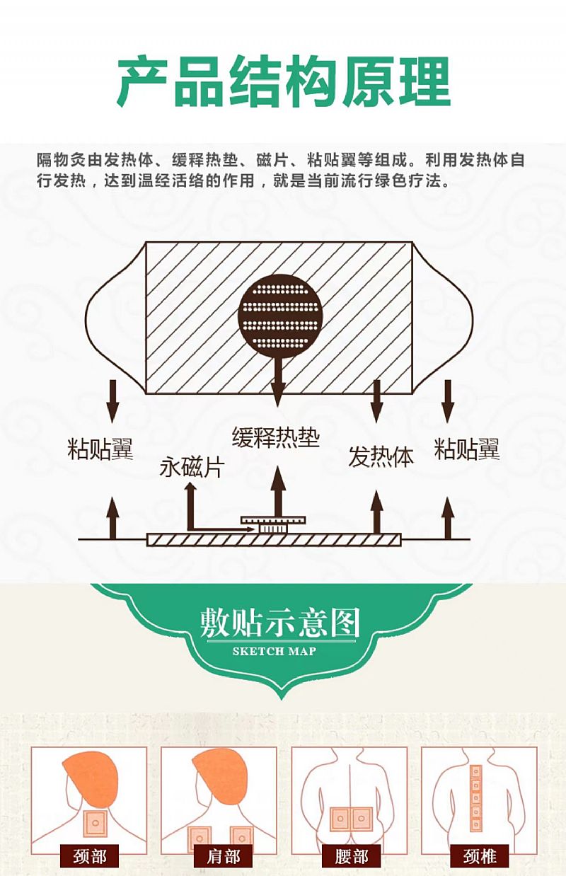 - 本品由发热袋、无纺布、远红外中心区域、压敏胶及硅油纸制成