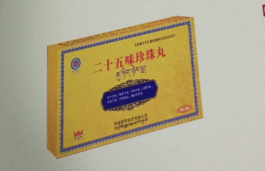 珍珠、白檀香、红檀香、沉香、广木香、肉豆蔻、丁香等祛风、安神开窍、熄风镇惊;牛黄、竹黄、草果、白豆蔻、藏红花清热活血;溪中碎云母、螃蟹、冬葵果利尿通淋;香旱芹、黑种子草熄风、祛寒;肉桂、荜拨温胃提火;犀角、短穗兔耳草干脓血、利痰;麝香杀虫、化瘀、止痛;诃子、毛诃子、余甘子平衡和合,治诸病。25味药物配伍共奏安神开窍、熄风镇惊、舒筋活络之功效,主治白脉病。