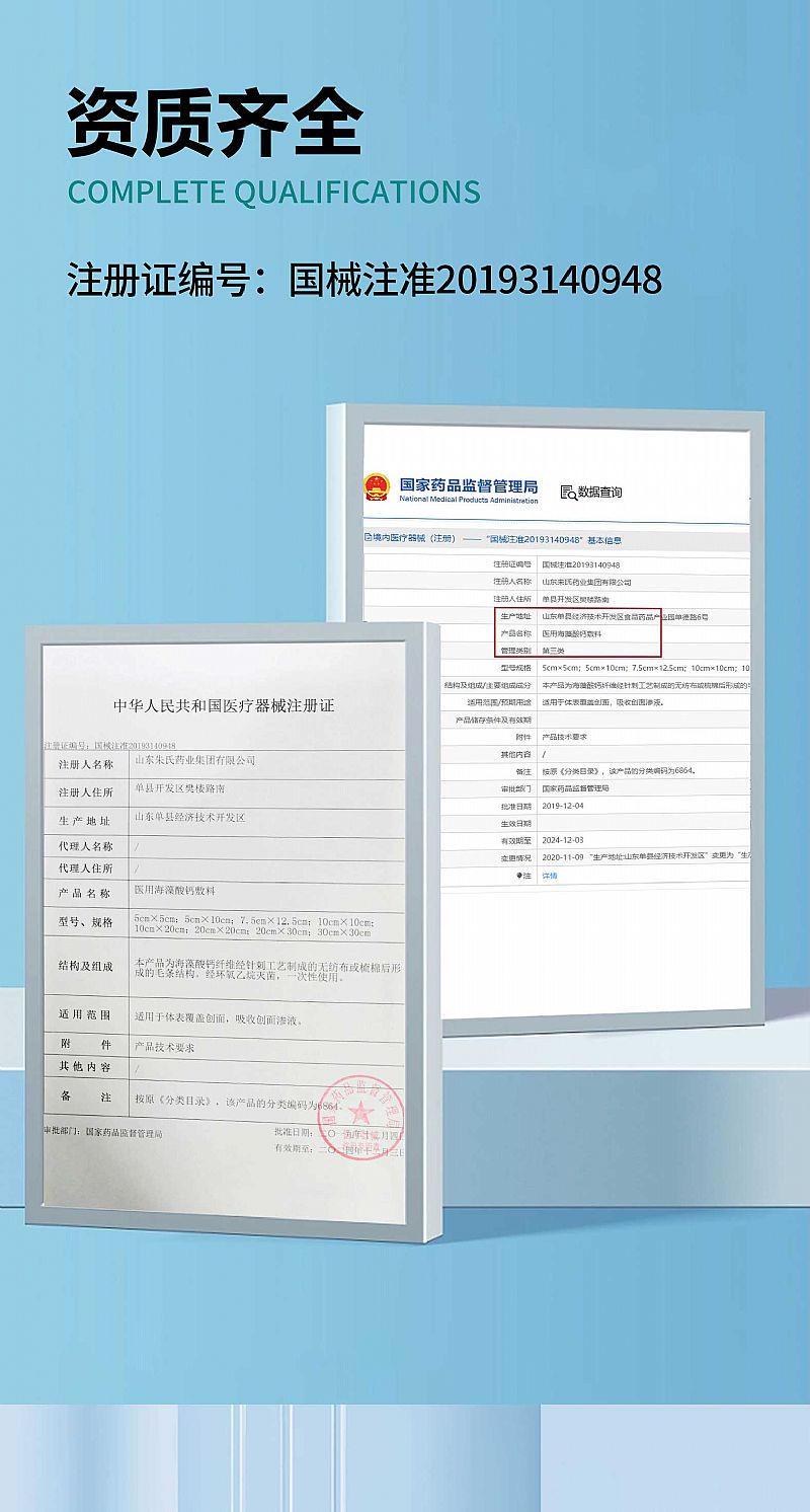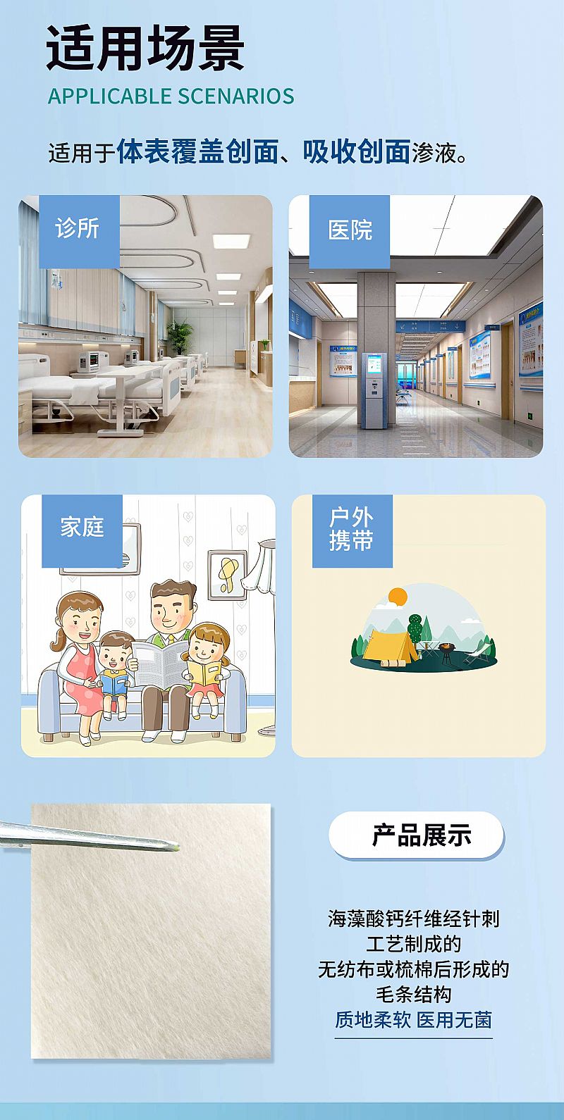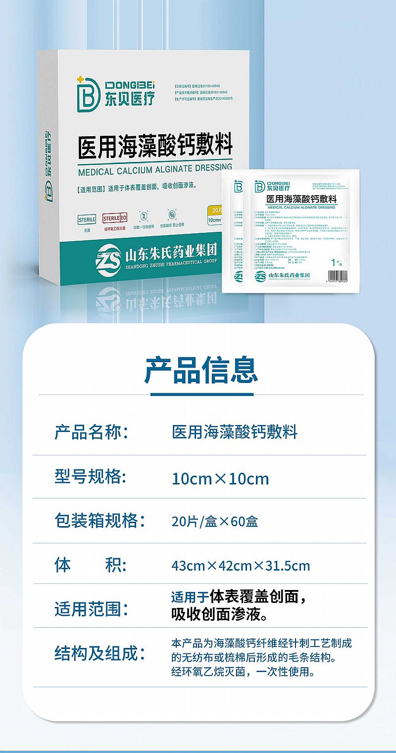 - 海藻酸钙纤维经针刺工艺制成的无纺布或梳棉后形成的毛条结构,本产品经环氧乙烷灭菌后应无菌,一次性使用