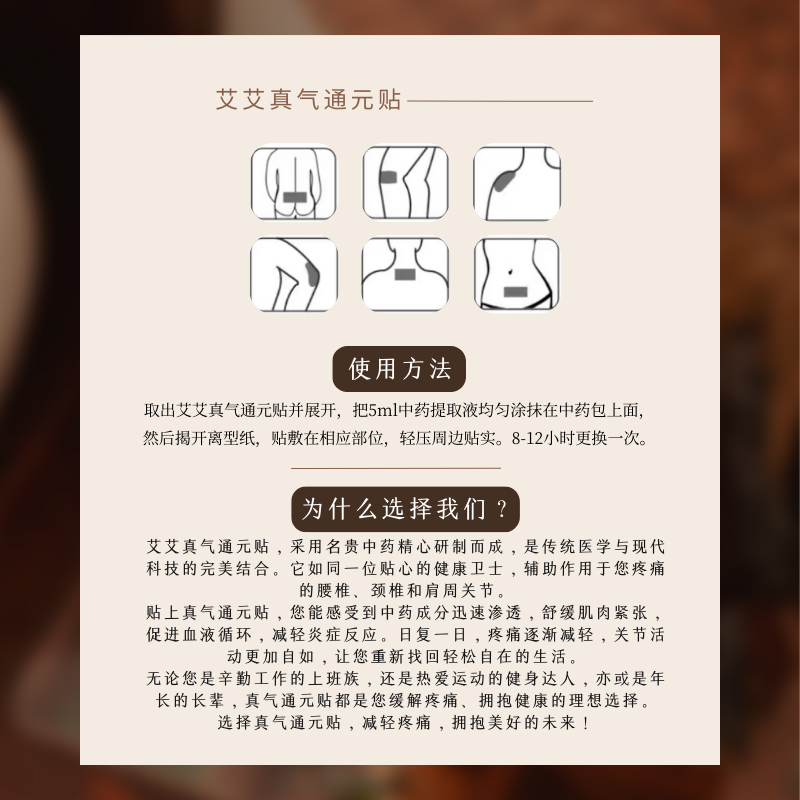 - 取出艾艾真气通元贴并展开,把5ml中药提取液,均匀涂抹在中药包上面,然后揭开离型纸,贴敷在相应部位,轻压周边贴实,8-12小时更换一次。