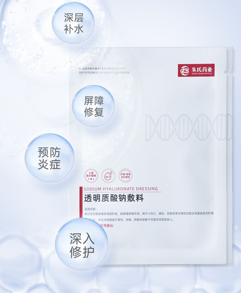 - 透明质酸钠敷料由聚丙烯无纺布、透明质酸钠、卡波姆和纯化水组成