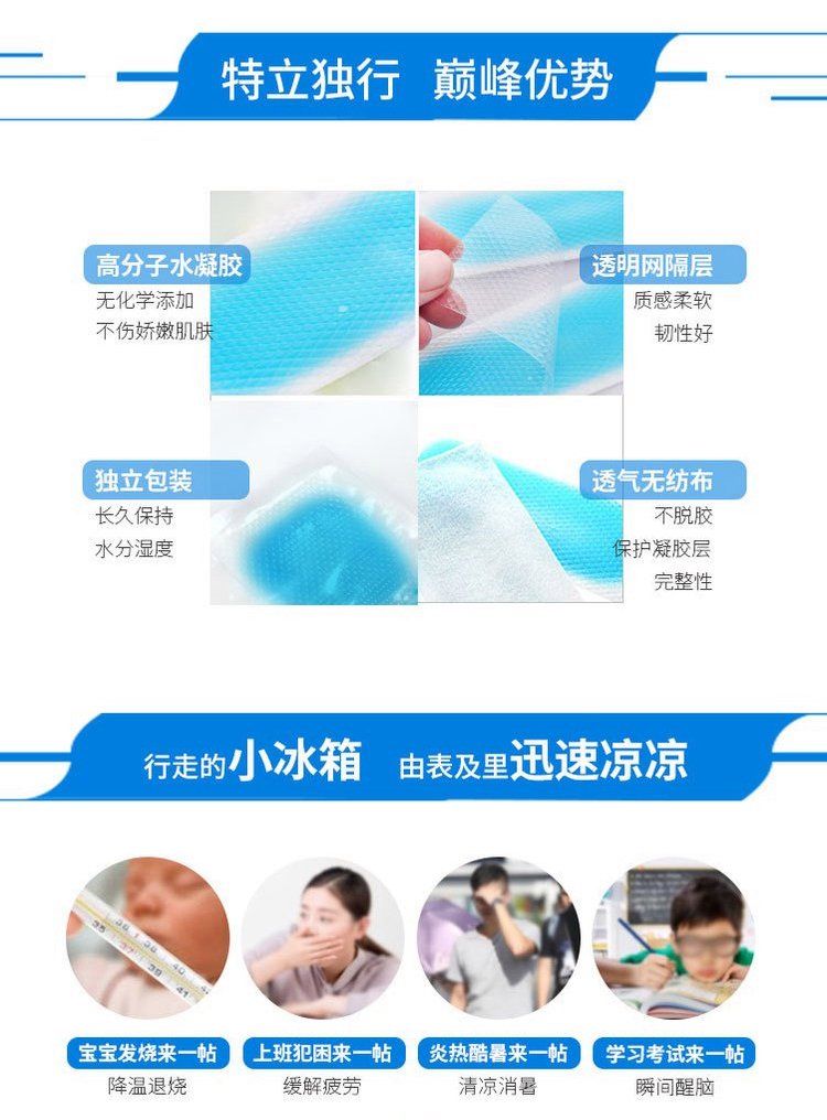 - 本品由无纺布背衬层、凝胶层、聚乙烯薄膜覆盖层组成。凝胶层由聚丙烯酸钠、聚乙烯吡咯烷酮(液体)、甘羟铝、甘油、食品添加着色剂(蓝色)、纯化水组成。降温物质不含有发挥药理学、免疫学或者代谢作用的成分。非无菌产品。