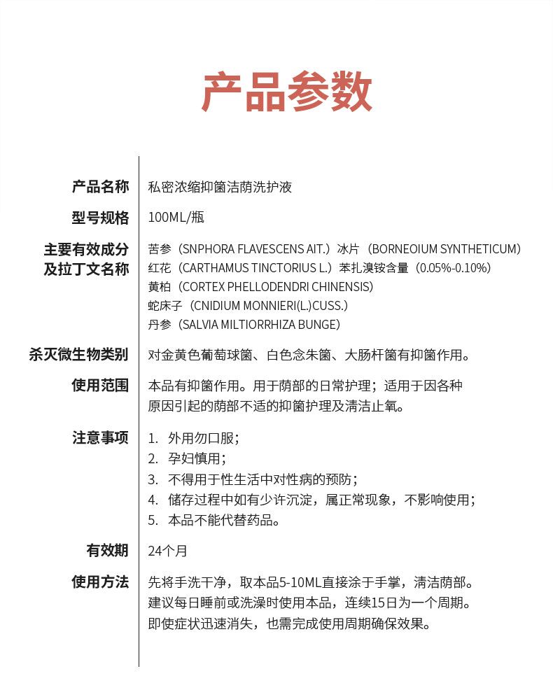 【温馨提示】本品为中愺药提取物及化药苯扎溴铵组合的复方卫生用品;试验证明:具有**的抑箘效果。