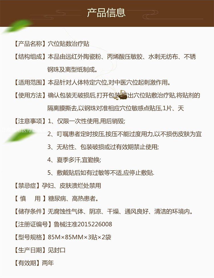 - 本品针对人体特定穴位,对中医穴位起刺激作用。