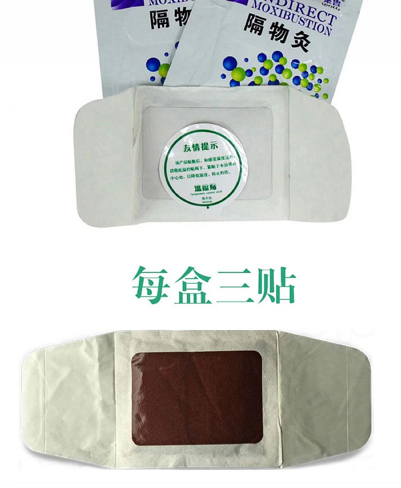- 确认包装无破损后,打开包装,取出隔物灸,将隔离膜撕去,按照传统隔物灸疗法贴于患处,至不再发热后更换。