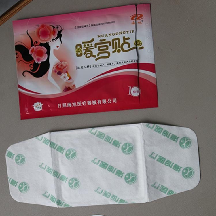 - 确认包装无破损后,打开包装,取出暖宫贴,将贴剂的隔离膜撕去,贴于患者下腹正中脐下三指对应的“气海穴”的内裤外侧,每24小时更换一次,流产连续使用5~10天;顺产连续使用10~15天;剖宫产连续使用15~20天。