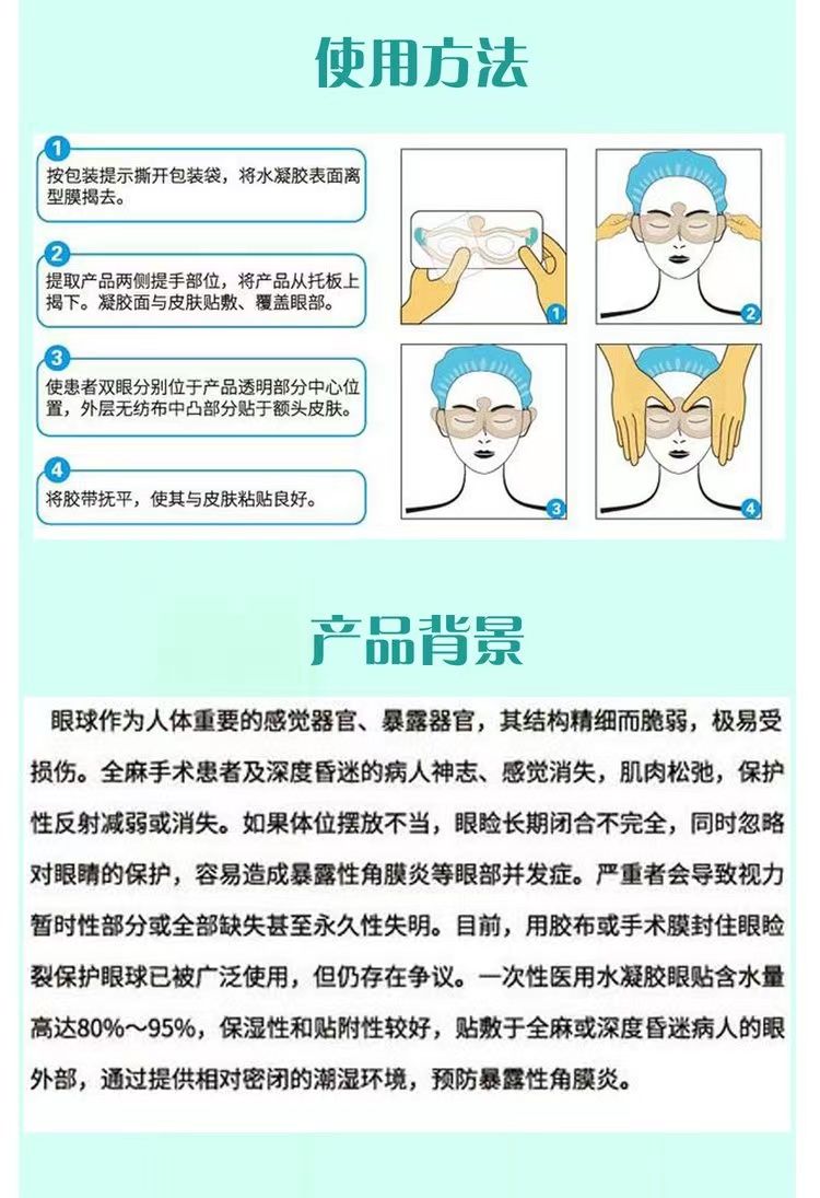 - 1、医护人员将产品从包装中取出,去掉隔离层,将水凝胶层贴敷于患者眼部。2、若用于全麻手术病人,建议在麻醉诱导期即开始使用,提前给患者眼部营造潮湿环境。3、可持续贴敷7-12小时/贴