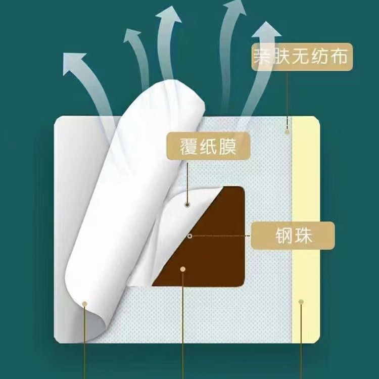 - 本品由远红外陶瓷粉、丙烯酸压敏胶、水刺无纺布、不锈钢珠及离型纸制成