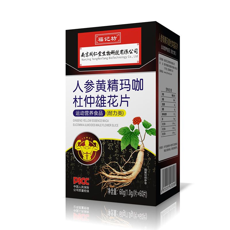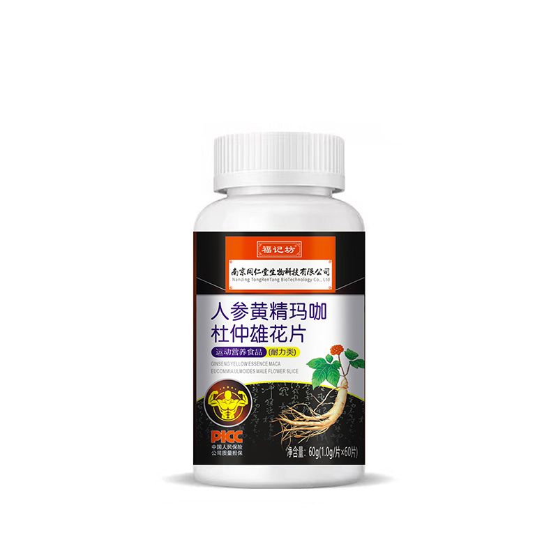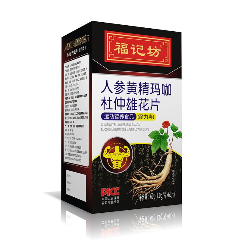 - 食用葡萄糖、玉米淀粉、麦芽糊精、人参(5年以下人工种植)、黄精、玛咖、杜仲雄花、海参肽、枸杞、怀山药、益智仁、硬脂酸镁、维生素B1、维生素B2、维生素B6。