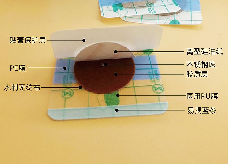 主要成分 由球状体和医用胶布,离型纸或聚乙烯膜组成贴于人体穴位处,通过外力仅起压力刺激作用。