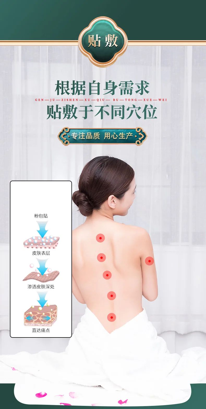 - 贴敷于皮肤,通过贴敷促进局部血液循环,实现成本透皮吸收与经络调理。