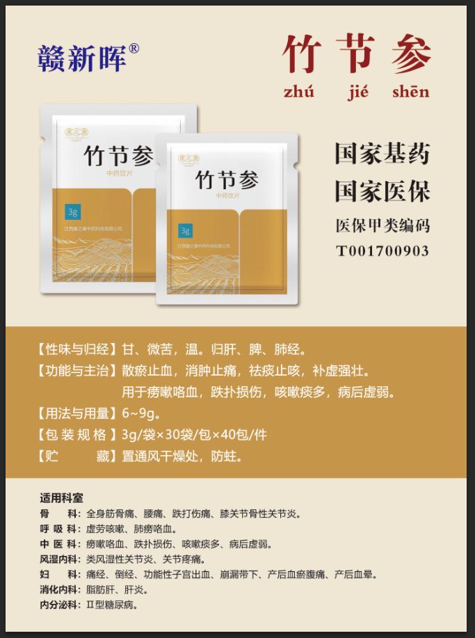 - 中医药振兴政策深度落地,大健康产业迈入高质量发展阶段,中药饮片凭借疗效确切、安全性高、临床适配性强的核心优势,市场需求持续攀升。竹节参作为《中国药典》收录的经典补益类中药饮片,兼具补虚强壮、散瘀止血、消肿止痛、祛痰止咳多重功效,**适配临床多科室高发疾病,尤其针对病后体虚、跌打损伤、虚劳咳嗽等临床常见病症,应用场景广泛、患者需求稳定。