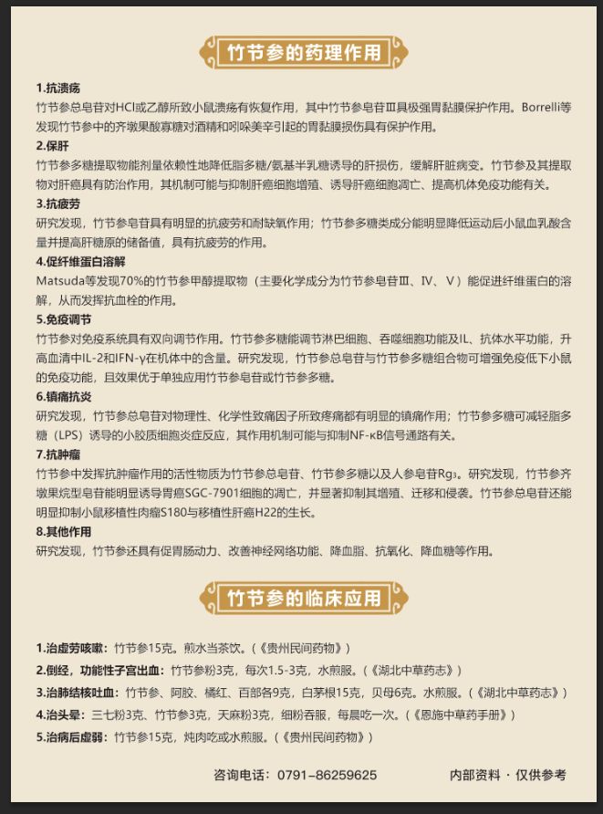 - 竹节参核心活性成分明确,符合《中国药典》标准,且含多种营养物质,临床功效与成分高度契合,为临床用药提供坚实的物质基础: